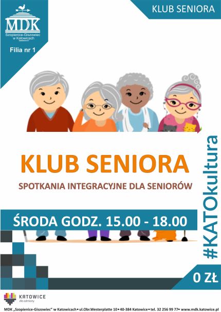 Klub Seniora spotyka się cotygodniowo, w każdą środę od godz. 15.00 w sali widowiskowej Filii nr 1 MDK „Szopienice-Giszowiec”.